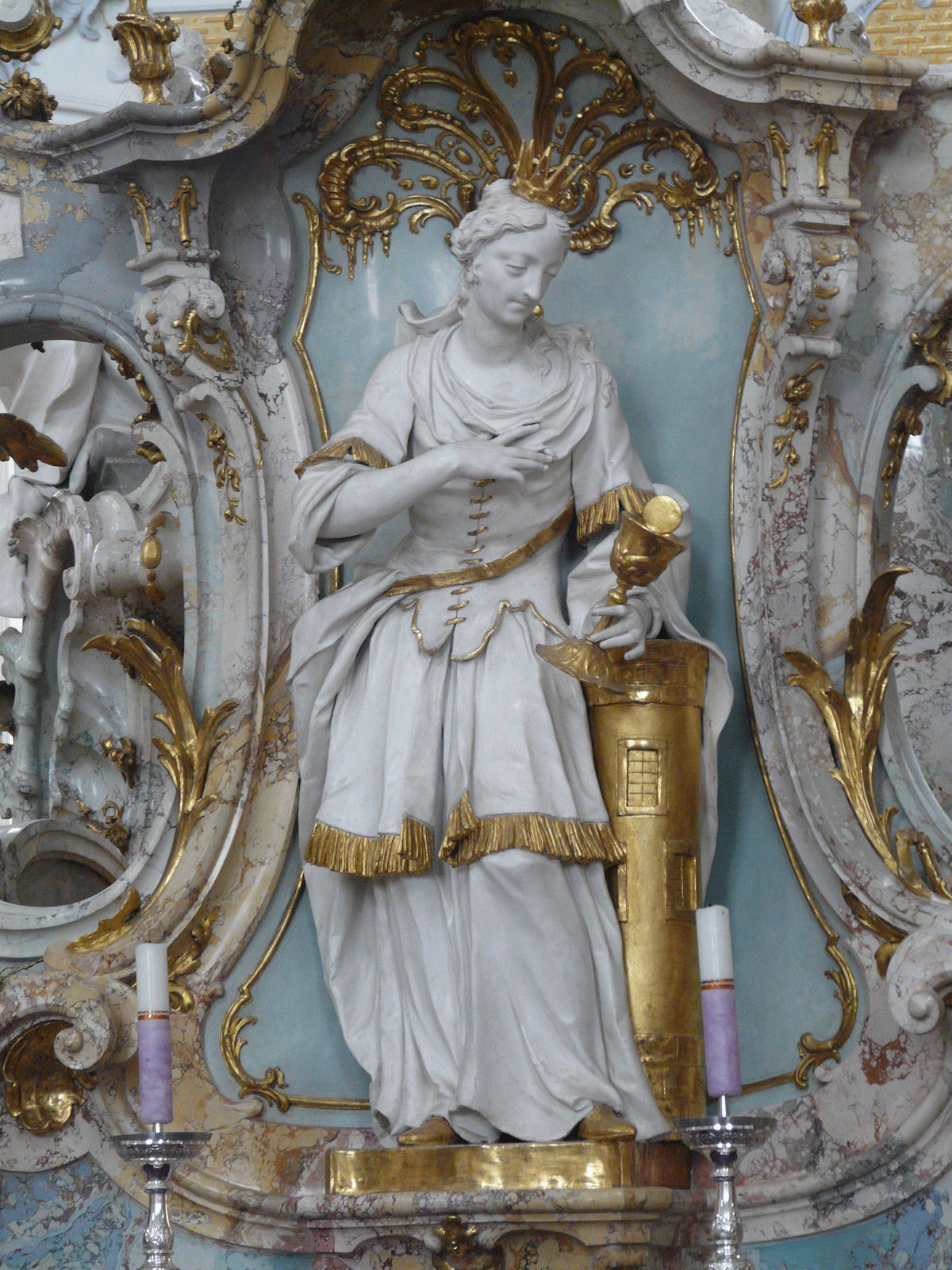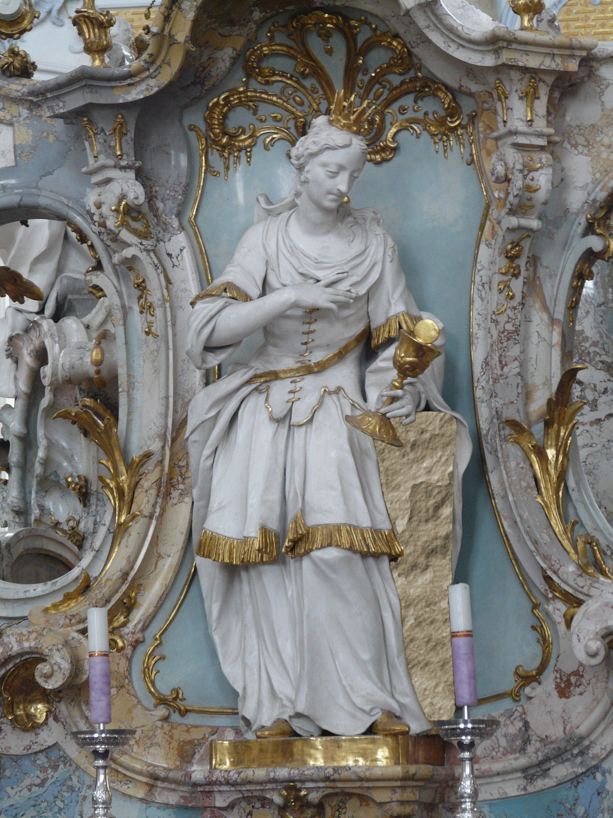 Hier hat jemand dieser Heiligen ihr wichtigstes Attribut geklaut. Wer ist es, was fehlt und zu welchem Werk gehört diese Figur?
